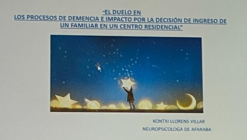 Azaroak 9, hitzaldi batean izan ginen Domusvi Gazalbide adinekoen egoitzan. Kontxi Neuropsikologa eta estimulazio zentroaren Kordinatzailea izan zen hitzaldia eman zuena izenburu honekin: Dolua dementzia prozesuan eta impaktua familia egoitzan sartzeko erabakian.