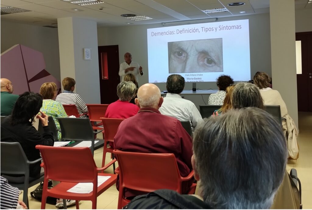 Maiatzaren 4an familien eskolari zuzendutako lehendabiziko hitzaldia izan genuen “Dementzia motak eta sintomak” izenburuarekin. Hitzaldia geriatrian eta gerontologian espezializatuta dagoen Iñaki Artaza medikuak eman zuen. Saioak ordu eta erdi iraun zuen eta bertara gerturatu ziren 31 pertsonen balorazioa oso ona izan zen. Familiak horrelako hitzaldiak asko baloratzen dituzte, beraien egunerokotasun ekintzendako oso lagungarriak baitira.