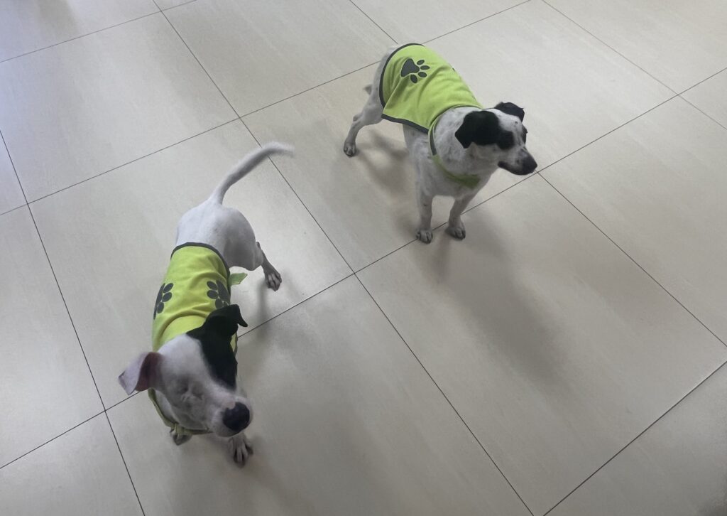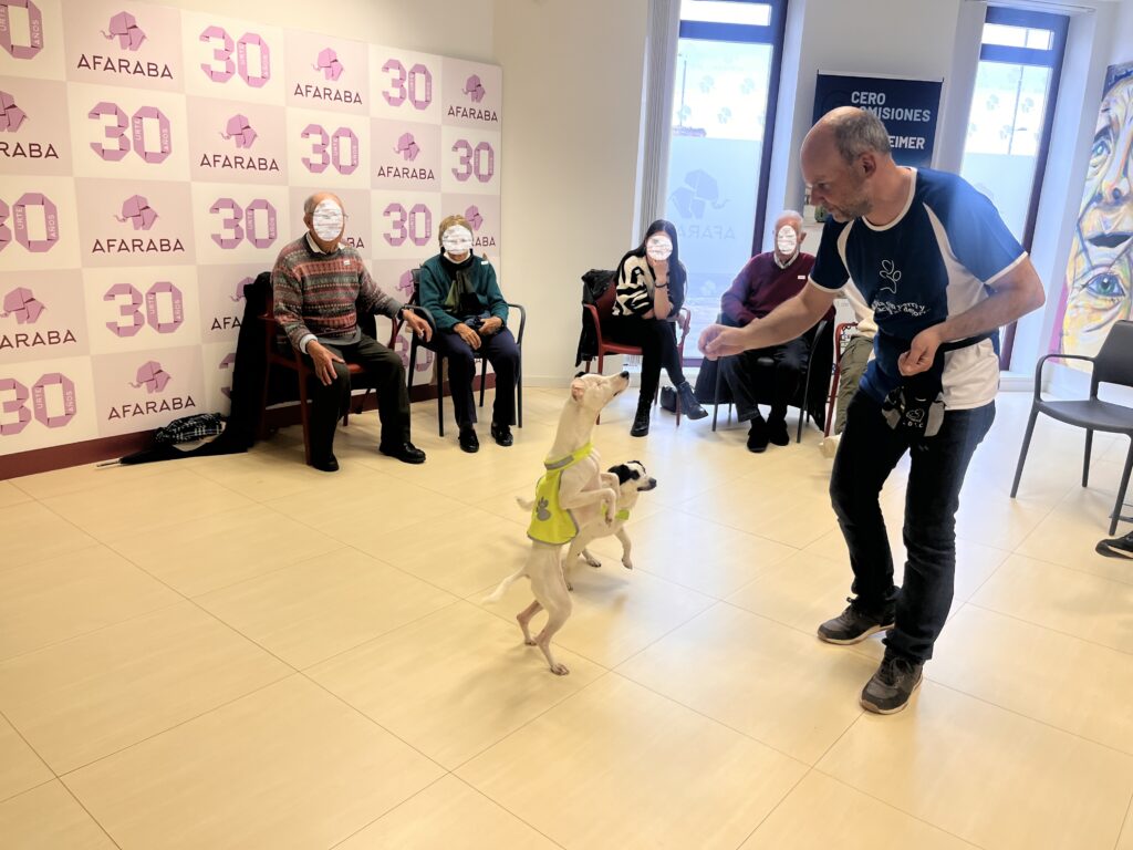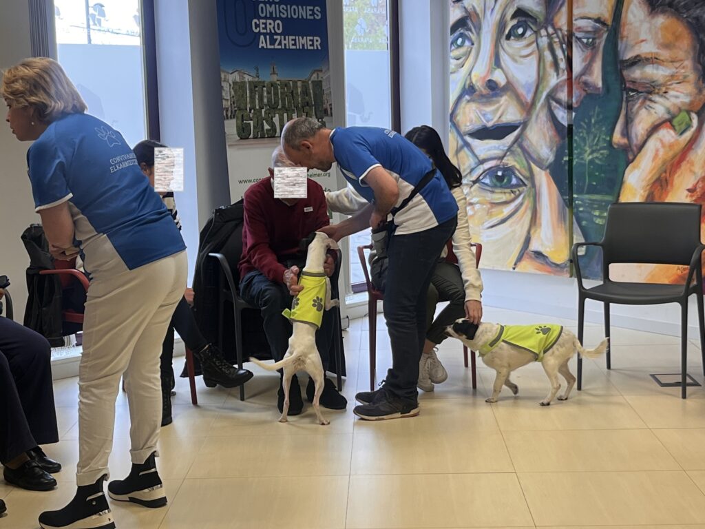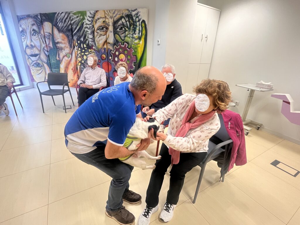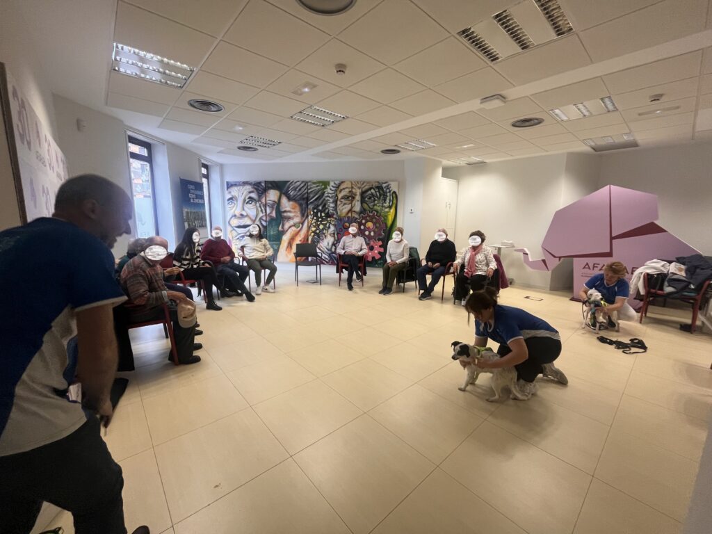 Junto a los profesionales acudieron Manchita y Ninfa, dos perras muy juguetonas y cercanas con quienes en función de la actividad interactuaron y se relacionaron con todos. Estas dos peludas son andaluzas, fueron rescatadas por abandono y problemas de salud, una de ellas está ciega pero mantiene perfectamente el resto de habilidades y la otra tiene un problema cognitivo con la que se realizan otras actividades para su interacción.